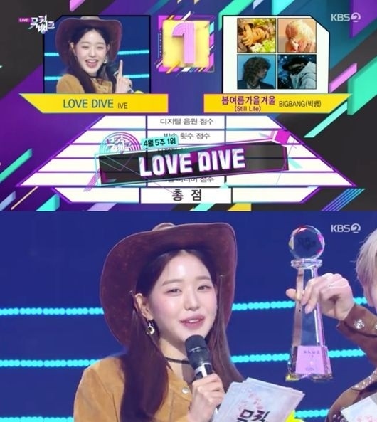 IVE在韓國於29日下午播放的KBS 2TV《音樂銀行》中連續3周獲得一位,擔任MC的張員瑛代表IVE獲得了獎盃。