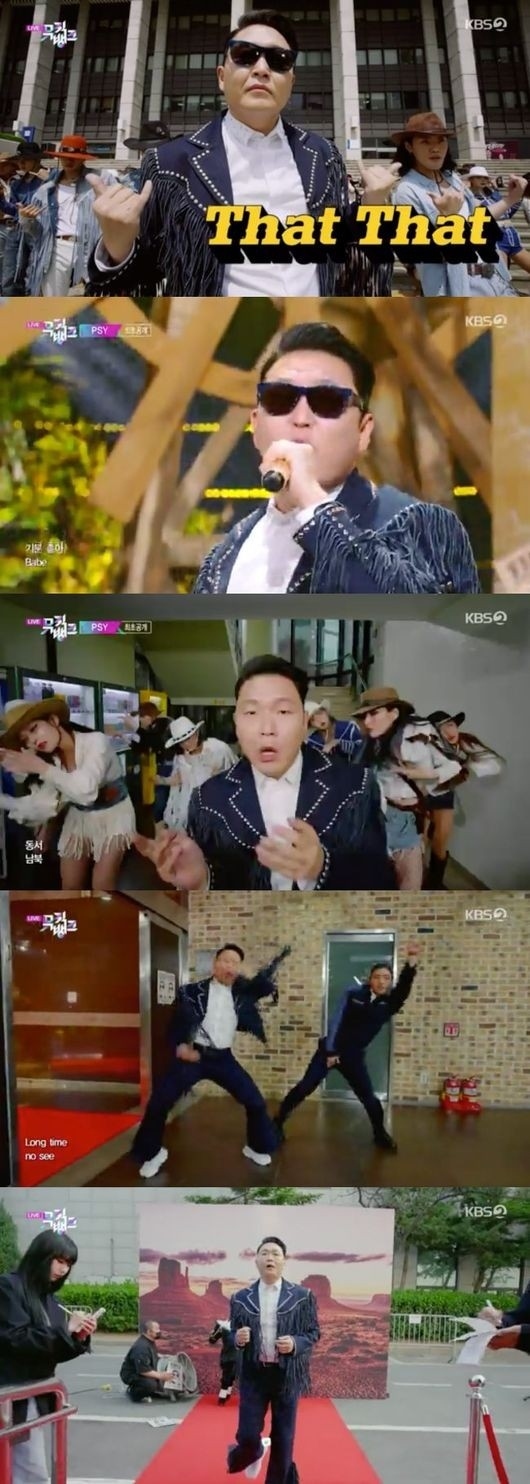 PSY以西部片主人公般的面貌回歸。BTS防彈少年團SUGA首次公開了參與制作和MV演出的第九張完整專輯《PSY 9th》的主打歌《That That(prod.&ft. SUGA of BTS)》的舞台,不愧是傳奇PSY,以史上最高的回歸舞台吸引了人們的視線。