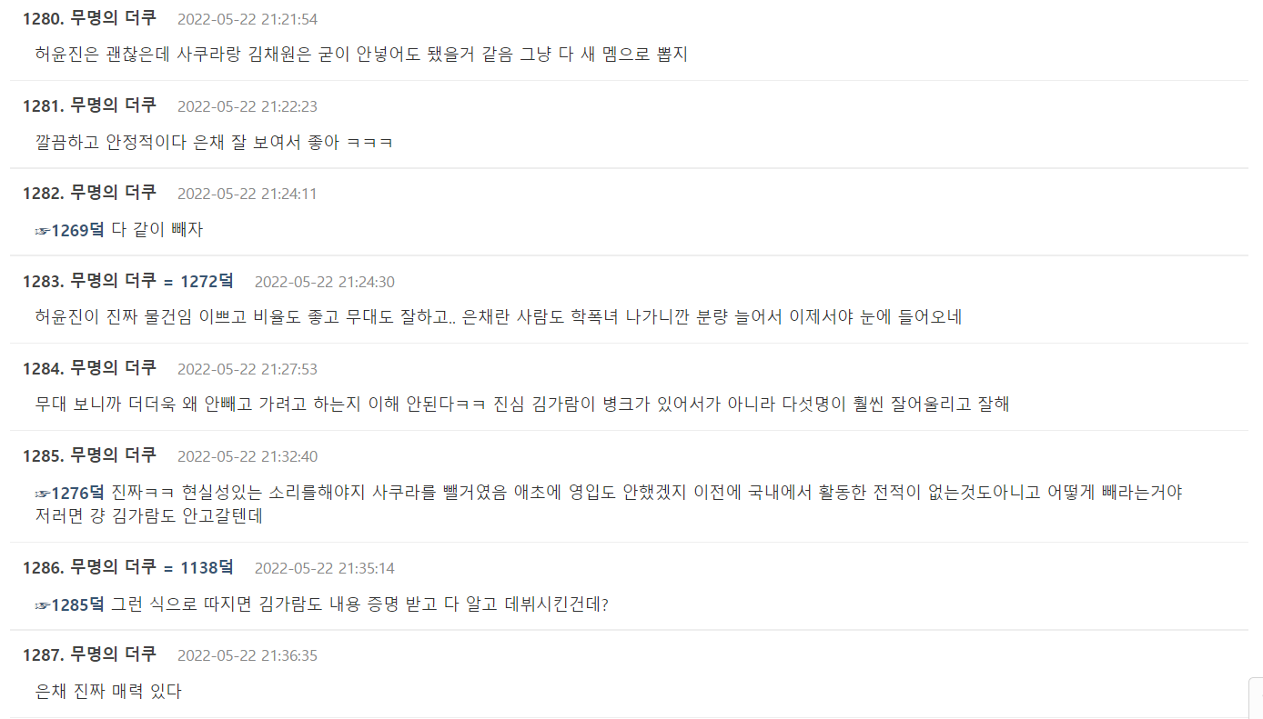 在看完LE SSERAFIM在《人氣歌謠》的舞台表演後,大量韓國網友留言表示“舞台感染力強,陣型也好看,沒有金佳覽的LE SSERAFIM更有魅力”、“許允珍真的好棒”、“不知道忙內原來這麼漂亮”、“我的小櫻好漂亮啊”、“5個人看起來更好”等等,但是也有不少網友對於LE SSERAFIM採取繼續抵制的態度,但比起之前一面倒的情況好了很多。