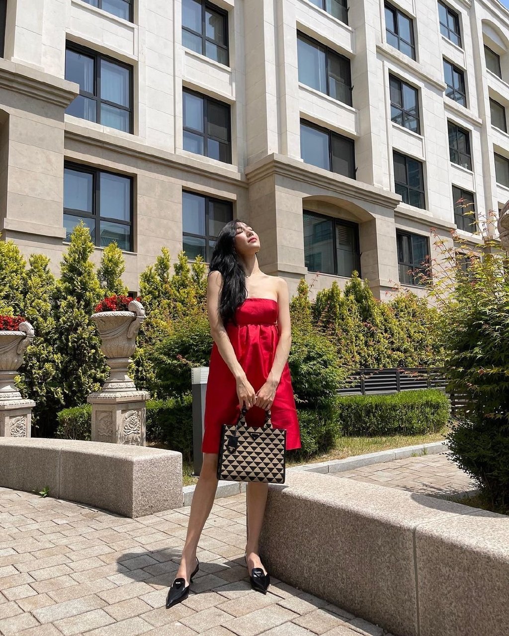 在公開的照片中,少女時代Tiffany坐在台階上,身後有建築物的背景,身穿一襲濃烈的紅色抹胸露肩迷你連衣裙,手中抱著某奢侈品牌的時尚包包,從筆直的鎖骨線到圓潤的肩線,Tiffany展現了她光滑潔白的肌膚。