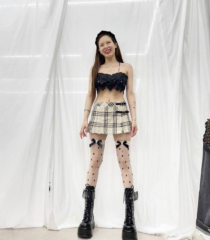 在公開的照片中,泫雅在鏡頭前笑容燦爛,身穿讓人聯想到比基尼泳裝的黑色心形吊帶上衣,搭配米黃色方格花紋迷你短裙,可愛的白色透明斑點長襪和黑色的厚底馬丁靴,泫雅展現了她苗條的身材,像筷子一樣的雙腿,瘦到隱約可以看到肋骨。