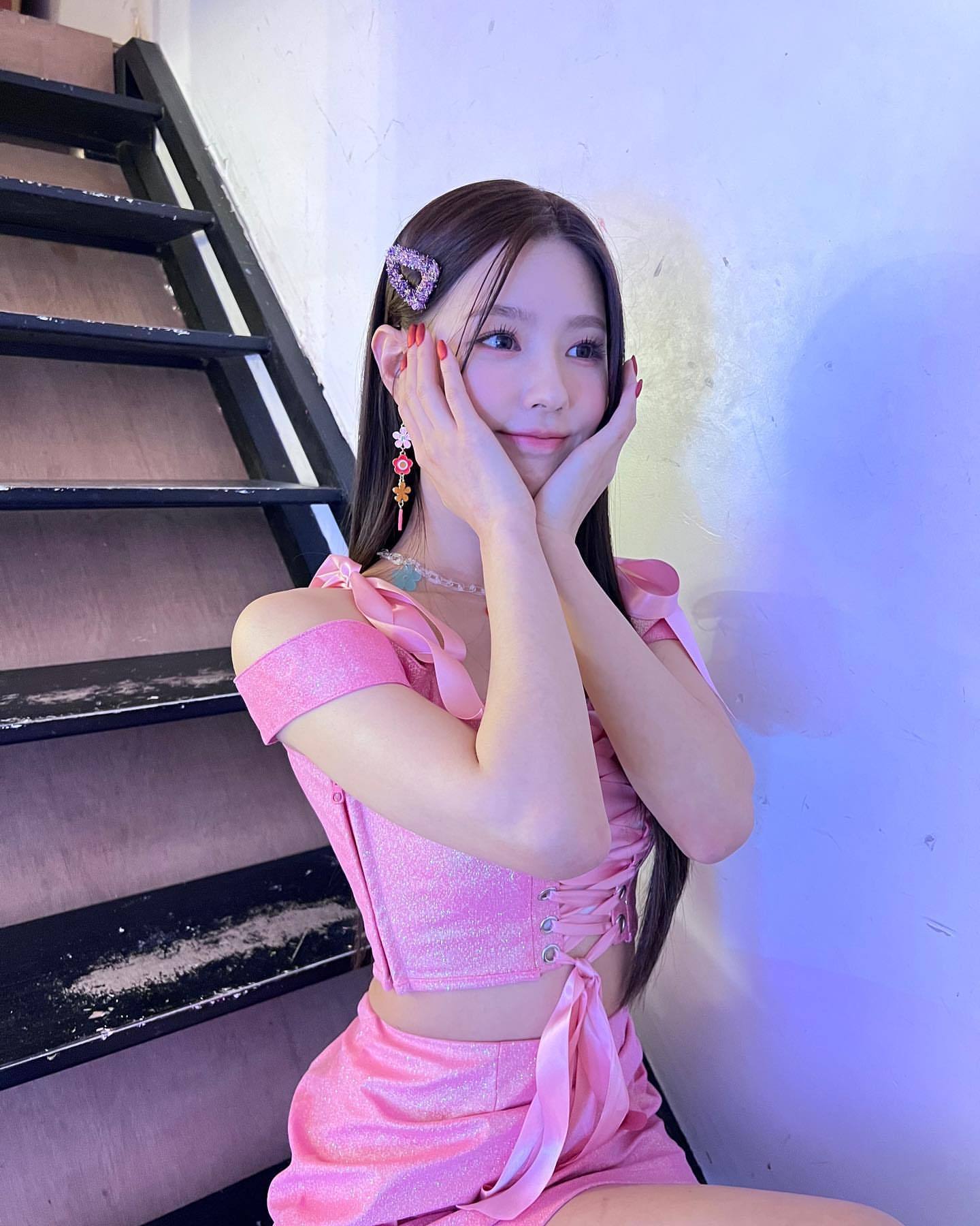 在公開的照片中,(G)I-DLE曺薇娟身穿粉色的帶有絲帶裝飾上衣和粉色的裙子,坐在樓梯上做出可愛的姿勢和表情,曺薇娟白皙的肌膚和修長的手臂吸引了網友們的注意,曺薇娟散發出活潑的魅力,微微露出的纖細螞蟻腰,也增添了一絲含蓄的性感。