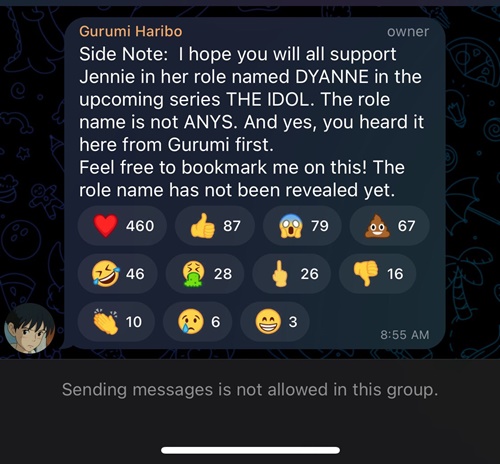 “Gurumiharibo”還提到了Jennie出演的美國電視劇《The Idol》的角色名稱。”角色名叫Dyanne,不是Anys,最先聽到的是Gurumi,角色名稱還沒有正式公佈。”