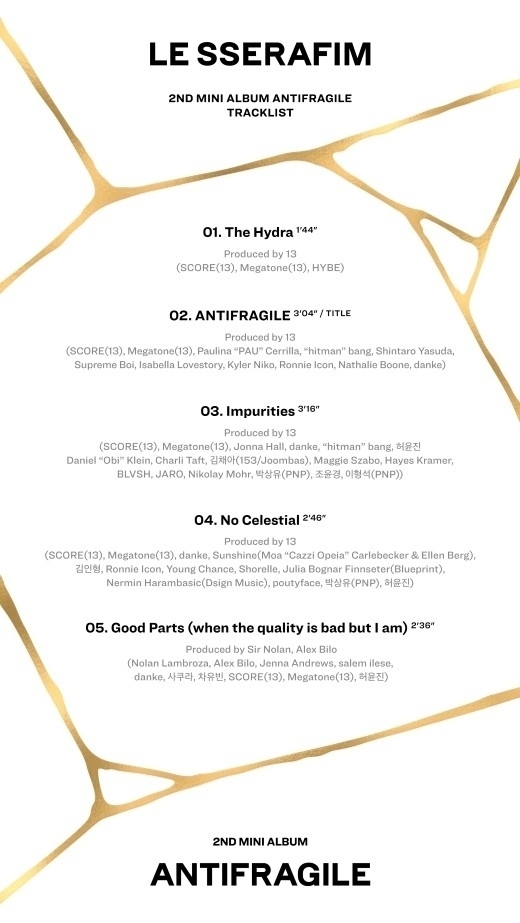 10月4日,LE SSERAFIM在SOURCE MUSIC的官方SNS上登載了第2張迷你專輯《ANTIFRAGILE》的曲目列表。新專輯將收錄主打歌《ANTIFRAGILE》和《The Hydra》、《Impurities》、《No Celestial》、《Good Parts(when the quality is bad but I am)》等共5首歌曲。