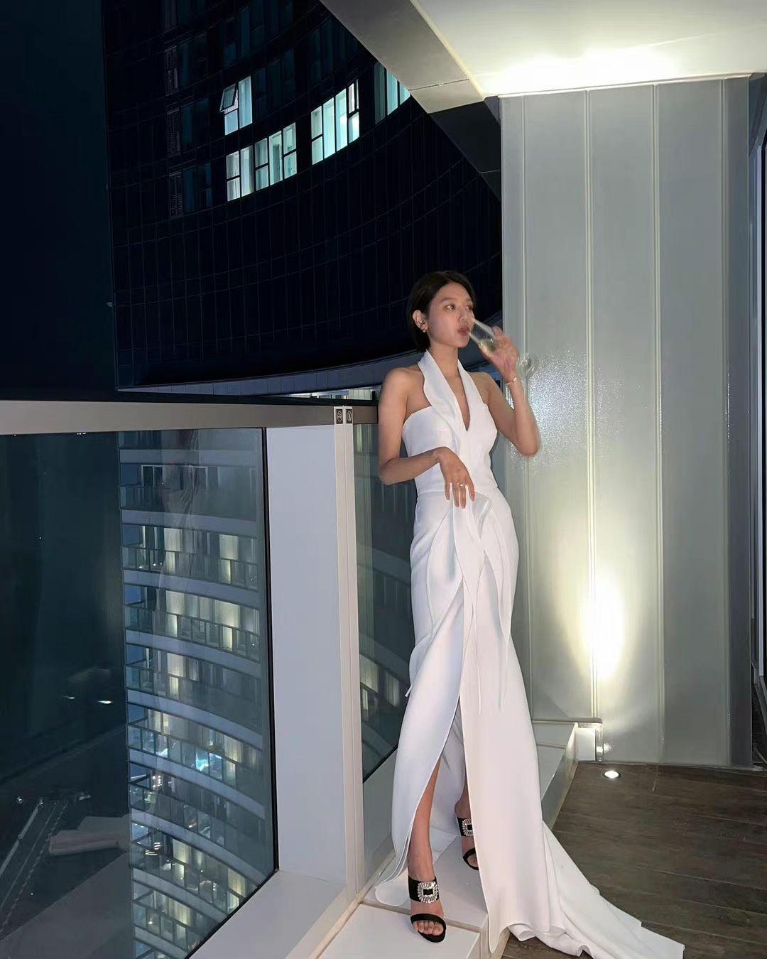 在公開的照片中,少女時代秀英身穿彰顯苗條身姿的白色緊身露肩晚禮服裙裝,手中拿著酒杯站在酒店的陽台上,一襲耀眼的白裙,營造出優雅又純真的氛圍,展現了秀英迷人的美貌,端著酒杯的秀英,秀出迷人的身體線條,擁有纖細苗條身材的秀英,骨感流暢的直角肩線和健康的膚色,也吸引了韓國網友們的注意力。