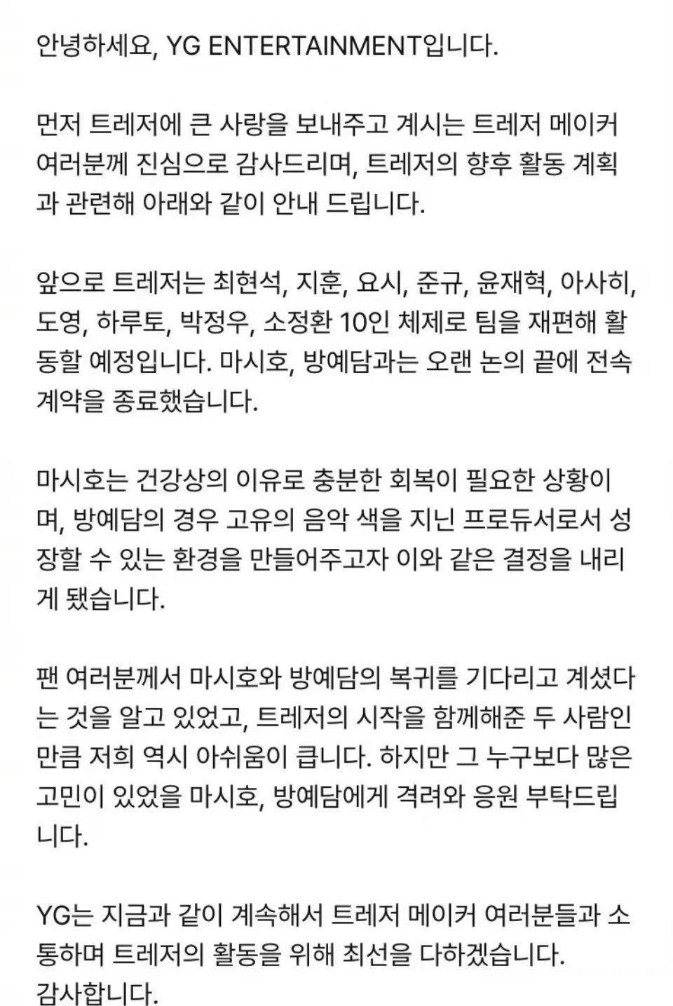 YG娛樂突然官宣旗下愛豆方藝潭和MASHIHO退出TREASURE,組合將以10人體制正常進行活動,官方給出的原因是MASHIHO身體情況不好,需要長時間恢復,至於方藝潭則是轉型音樂製作人方向,對於這樣的情況一點都不感到奇怪,要知道早在6月份的時候,這兩個人就被YG娛樂從TREASURE的集體照上給P掉了。