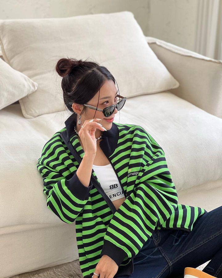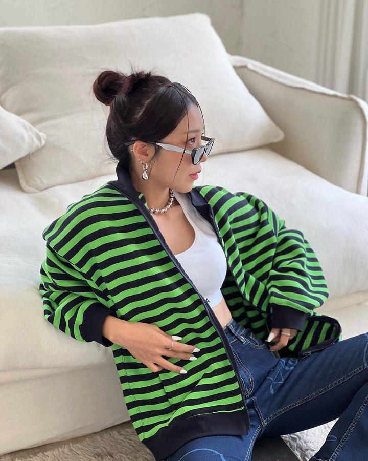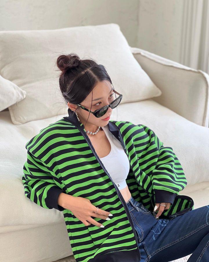 在公開得到照片中,Apink鄭恩地身穿白色的緊身運動背心,外罩黑色和綠色條紋的夾克,搭配藍色的牛仔褲,坐在沙發前拍照,戴著墨鏡頭髮盤起的鄭恩地,展現出乾淨利落的視覺效果,脖子上和耳朵上閃亮的飾品增添了時尚的氛圍感,特別是鄭恩地豐滿迷人的身材,展現了她無法阻擋的魅力,吸引了韓國網友們的目光。