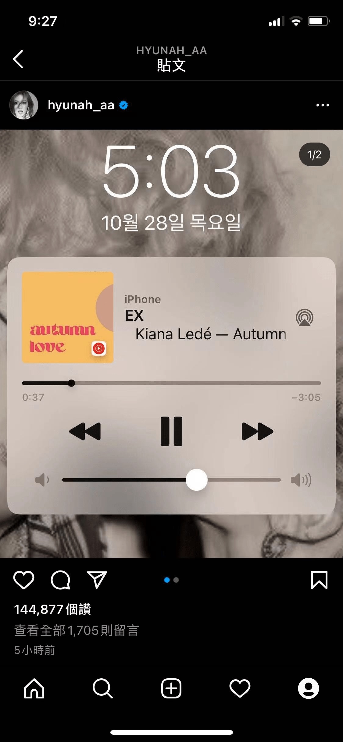 而且去年差不多時間段的10月28日上午五點多,泫雅在Instagram先是發了一個分享歌曲《EX》的動態。