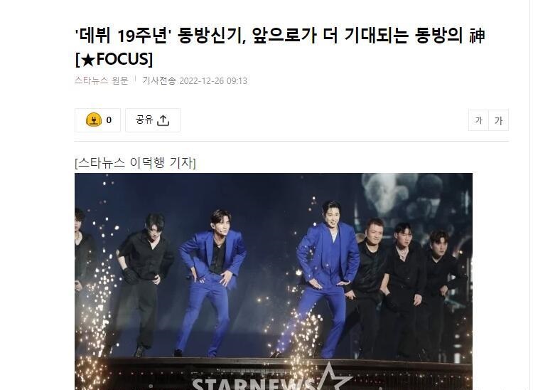 據韓國媒體報導:2022年12月26日是東方神起(TVXQ)在韓國出道的第19年。2003年12月26日,東方神起通過SBS年末特輯《寶兒&布蘭妮特輯》首次亮相,拉開了“二代團”時代的帷幕。