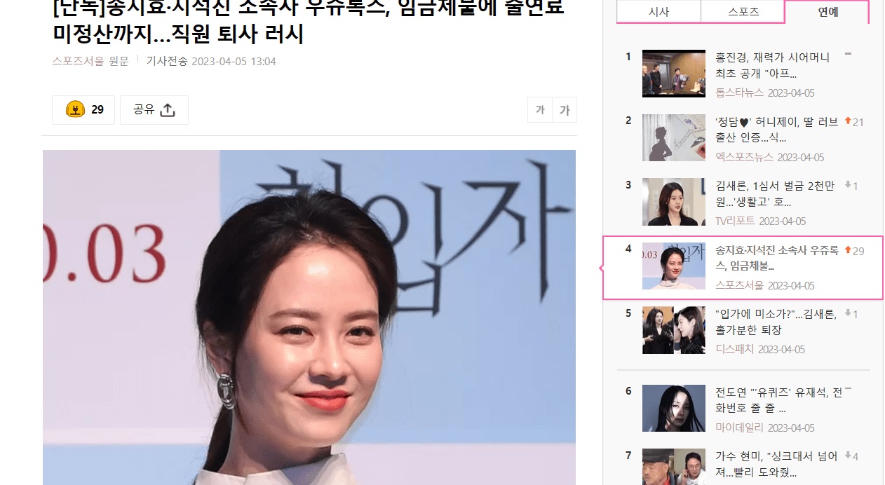去年底才簽約到新經紀公司UZU ROCKS的韓國女星宋智孝,才與《RM》老同事池錫辰同鍋吃飯的半年時間,新東家就被曝光大面積欠薪,不僅演藝事業要受到一些影響,而且錢財方面也可能面臨大額損失。