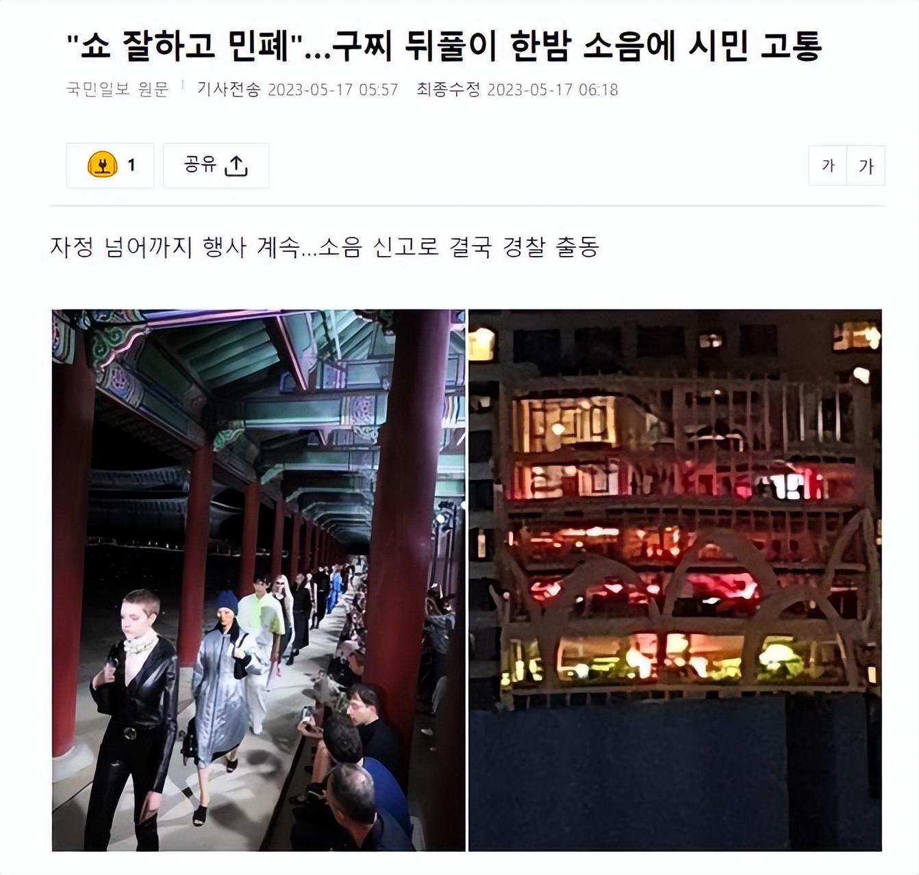 韓國景福宮舉辦時裝秀後,晚間派對噪音擾民,韓國網友罵聲一片
