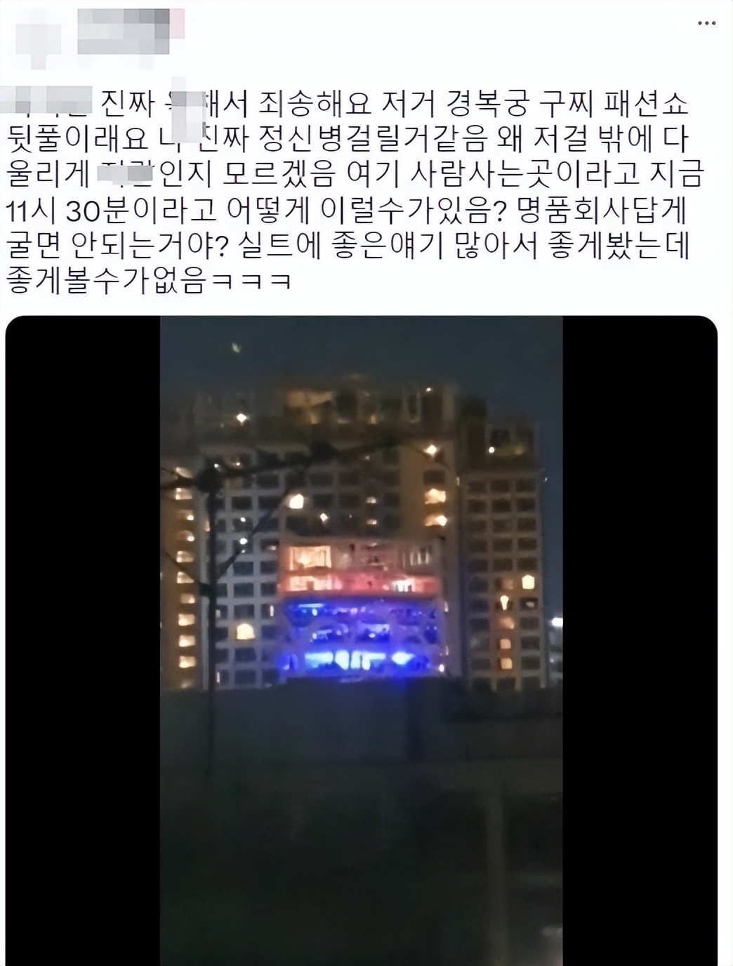 事實上,韓國警察也因噪音報告而出動,17日凌晨1時30分左右,另一位網友B在推特上發帖稱,撲通撲通聲一直到深夜12時,警察終於出動了,我在想那是什麼,但據說這是在景福宮舉行的Gucci 秀的餘興派對,在韓國網友公開視頻中,隨著警笛聲響起,警察出動,事件已有所結束。