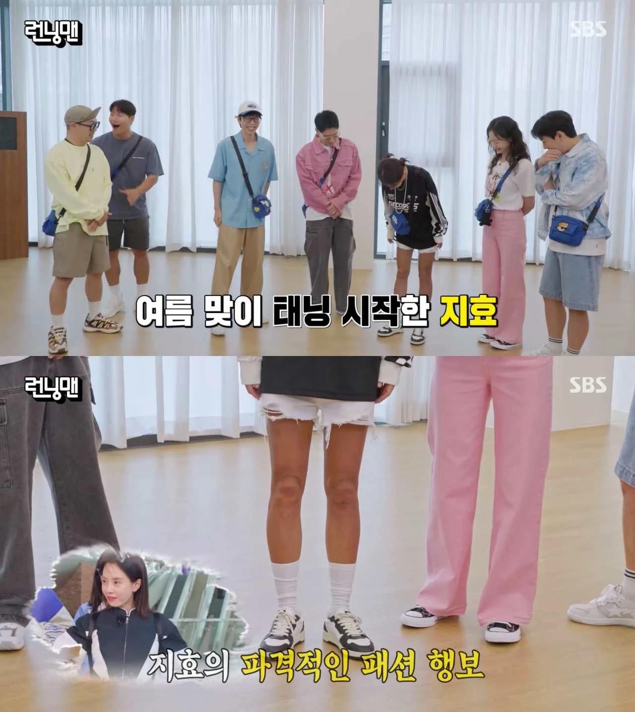 看到宋智孝美黑後的腿,《Running Man》的成員們都驚呆了,宋智孝以非常規的時尚舉動讓成員們大吃一驚。