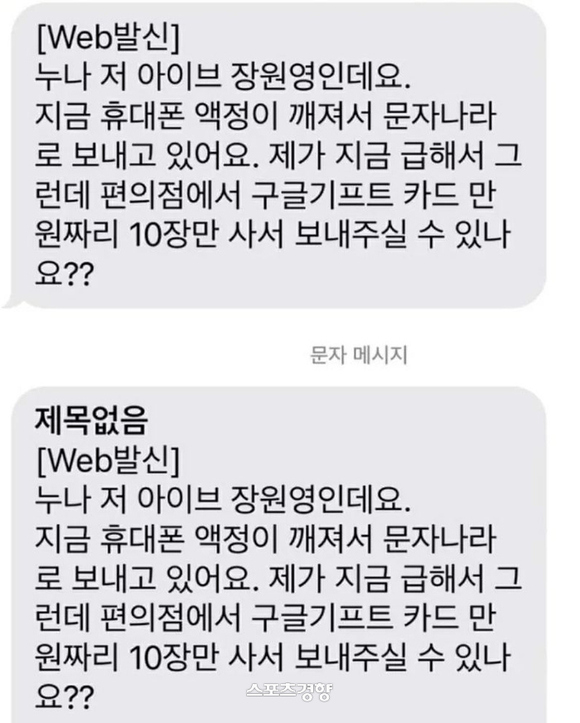 據該網友透露,冒充犯說 :「我是IVE的張員瑛,現在手機螢幕壞了,只能透過簡訊發訊息,因為太著急了,能不能在超商買10張價值10000韓元的Google Play禮物卡發給我?」