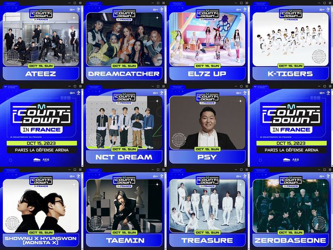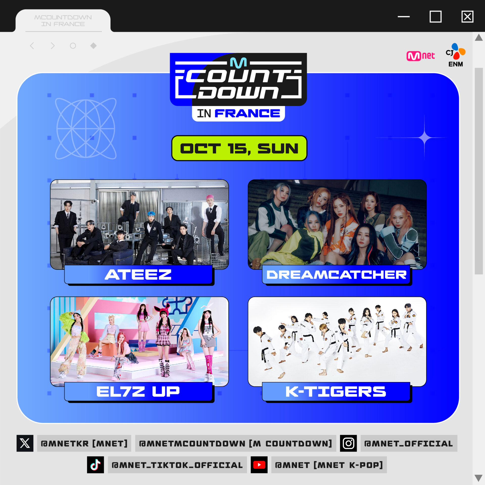此次出演《M COUNTDOWN In FRANCE》的藝人有ATEEZ、DREAMCATCHER、EL7Z UP、K-Tigers、NCT DREAM、PSY、MONSTA X的Shownu與亨願、SHINee泰民、TREASURE、ZEROBASEONE等10組。