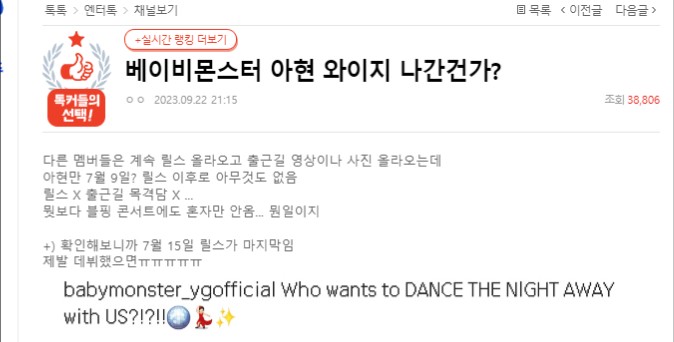 與“Ahyeon”在同一所學校“翰林高中”上學的一位網友寫道:「最近沒怎麼看見Ahyeon,以前常常路過時打招呼,戴著藍色的AirPods Max去自動販賣機買吃的。」,看起來她既沒有去YG也沒有去學校,讓粉絲感到擔憂,”退團傳聞”也正在散播中。