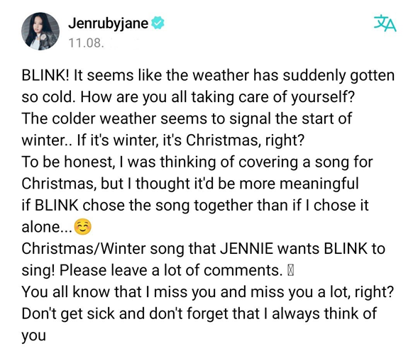 Jennie透過粉絲社區表示:「天氣似乎突然變得非常寒冷。大家都好嗎?寒冷的天氣似乎預示著冬天的開始…如果是冬天,那就是聖誕節,對吧?老實說,我正在考慮為這個節日演唱一首歌,但我覺得如果不是我獨自選擇歌曲,而是與BLINK一起選擇,這會更有意義… 你們都知道我很想念你們,是吧?別生病,也別忘記我總是想著你們。」