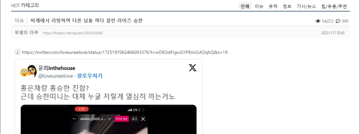 RIIZE承漢和TXT秀彬的過去直播外洩,其中提到LE SSERAFIM的”洪恩採”,引起了關注。
