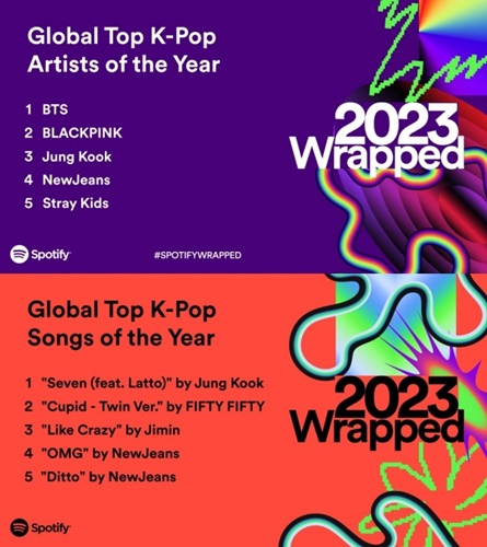 此外,「Spotify」還發布了針對「K-POP」的年度榜單。2023年全球最受歡迎的「K-POP」歌曲是「Seven」,其次是Fifty Fifty的「Cupid」,第三位是智旻的「Like Crazy」,第四和第五分別是 NewJeans的「OMG」和「Ditto」。