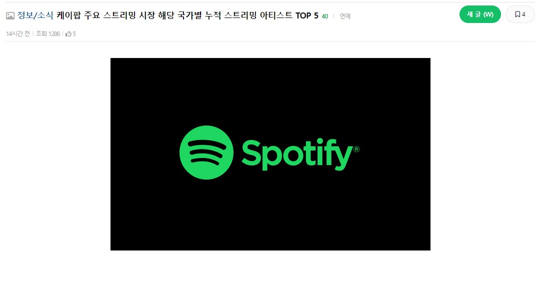 在韓國網路社區instiz上,韓網友發表了在Spotify上在不同國家擁有最高總播放次數的前五名歌手,他們查看的地區包括南韓、美國、日本、加拿大、墨西哥、澳大利亞、印度、印尼、菲律賓、泰國和馬來西亞。