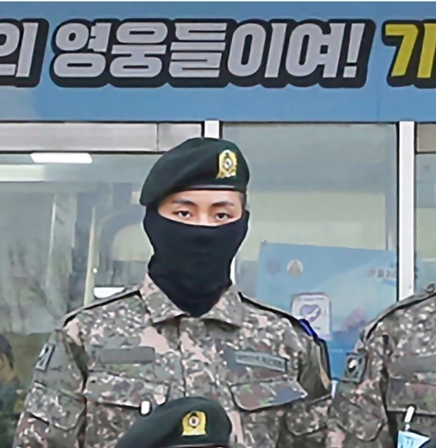 公開的照片中,V和RM與其他訓練兵一起拍攝了團體照片。RM在訓練兵後面微笑,而V的照片只露出眼睛部分,但他散發出一股堅定的氣息。