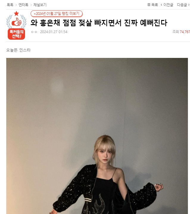 在1月27日,LE SSERAFIM忙內成員公開了她在Instagram上的最新照片,在這些照片中,洪恩採穿著一條黑色裙子和運動衫,展現了她盛開的美麗。