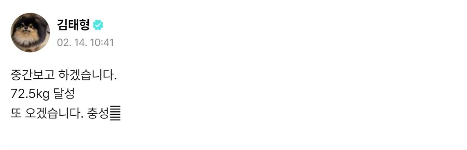 在14日,他透過粉絲社群平台Weverse表示「中間報告,達成了72.5公斤」,並說「待會再來,忠誠!」,引起了笑聲。
