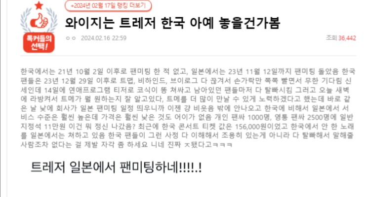 在韓國網路社區「Nate Pann」上出現了一則名為「TREASURE好像完全放棄了韓國」的文章,引起了熱議。發文者似乎是TREASURE的粉絲。該文章指出由於在韓國的活動減少,大量粉絲開始流失。