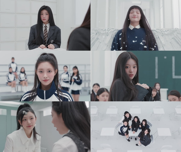 影片以成員們聚集在空蕩的白色教室裡坐著的場景開始。隨後,五位成員在想像和現實之間穿梭,展示了迷人的魅力。