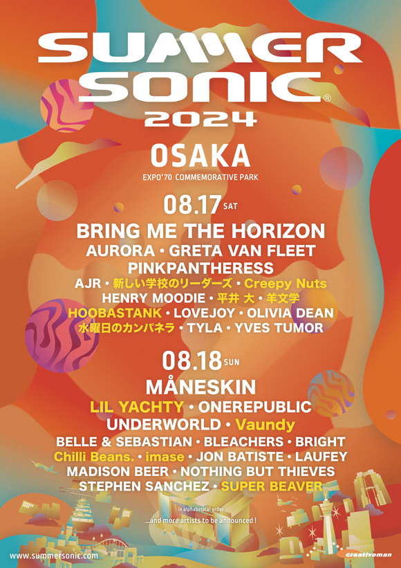 在由MÅNESKIN擔任主標藝人樂團的8月17日(週六)東京和18日(週日)大阪的演出中,將超越嘻哈音樂範疇,積極嘗試搖滾/另類音樂風格並廣受好評的年輕饒舌歌手利爾·亞蒂將登場,去年在SUMMER SONIC作為海灘舞台策展人成功舉辦了以海外藝人為主要內容的特別舞台的星野源也將參加SUMMER SONIC東京,同樣,以非凡的音樂感和一系列熱門曲目帶領的Vaundy也將在SUMMER SONIC大阪上演。