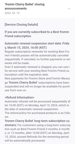 根據粉絲上傳的截圖,公告內容指出:「Cherry Bullet」服務將於2024年3月15日16時停止自動續訂,並停止新的購買。
