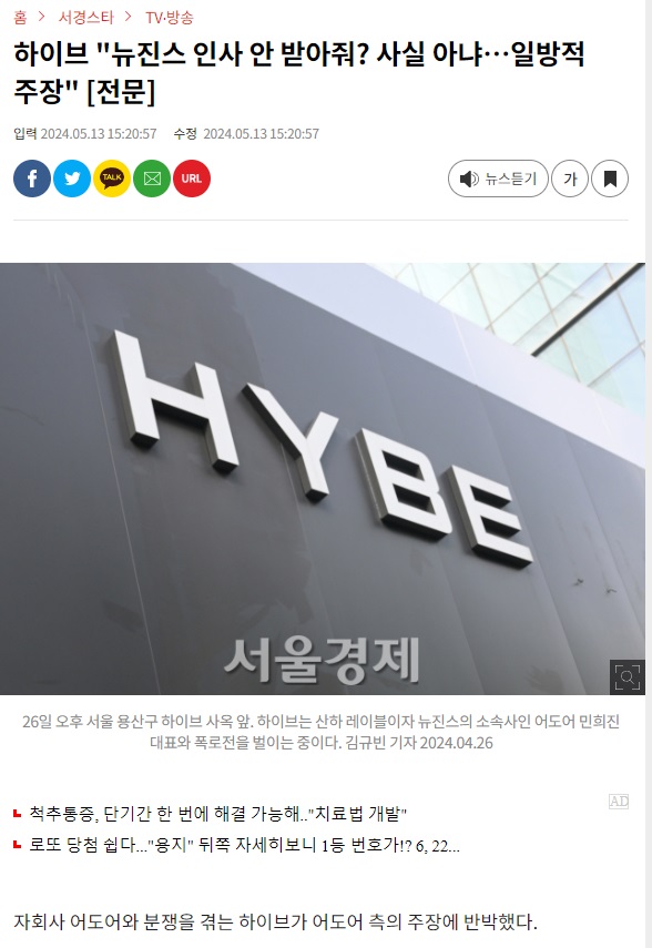 對此,HYBE透過官方新聞稿回應道:「根據某些媒體報導,13日有一封由家長發送給本公司的郵件,本公司將進行解釋。我們在4月3日收到了這封郵件,並在4月16日已經回覆,其中已經澄清了不是抄襲等問題。ADOR事務的開始”從不打招呼等冷遇開始”的說法是單方面的主張,並非事實。」