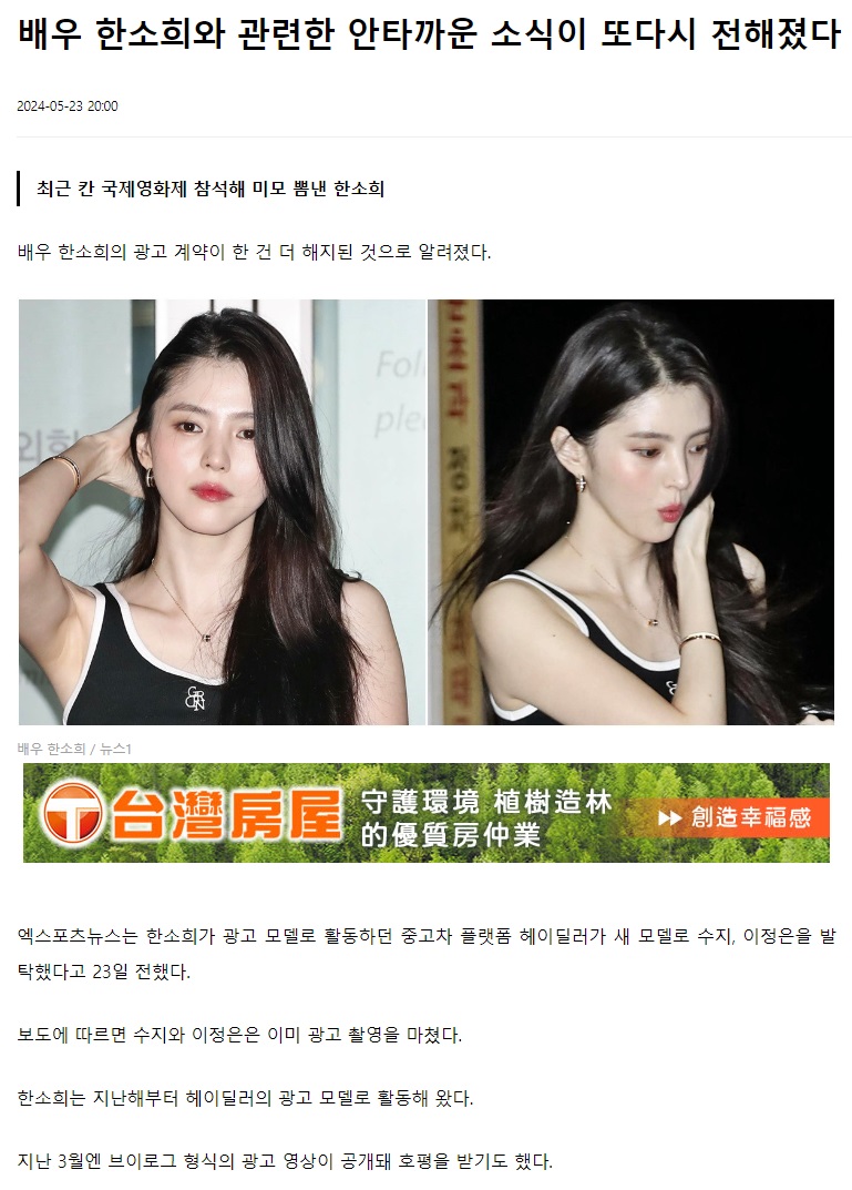 據報導,女演員韓韶禧的另一個廣告代言合約已經到期終止。