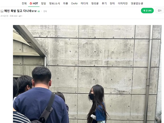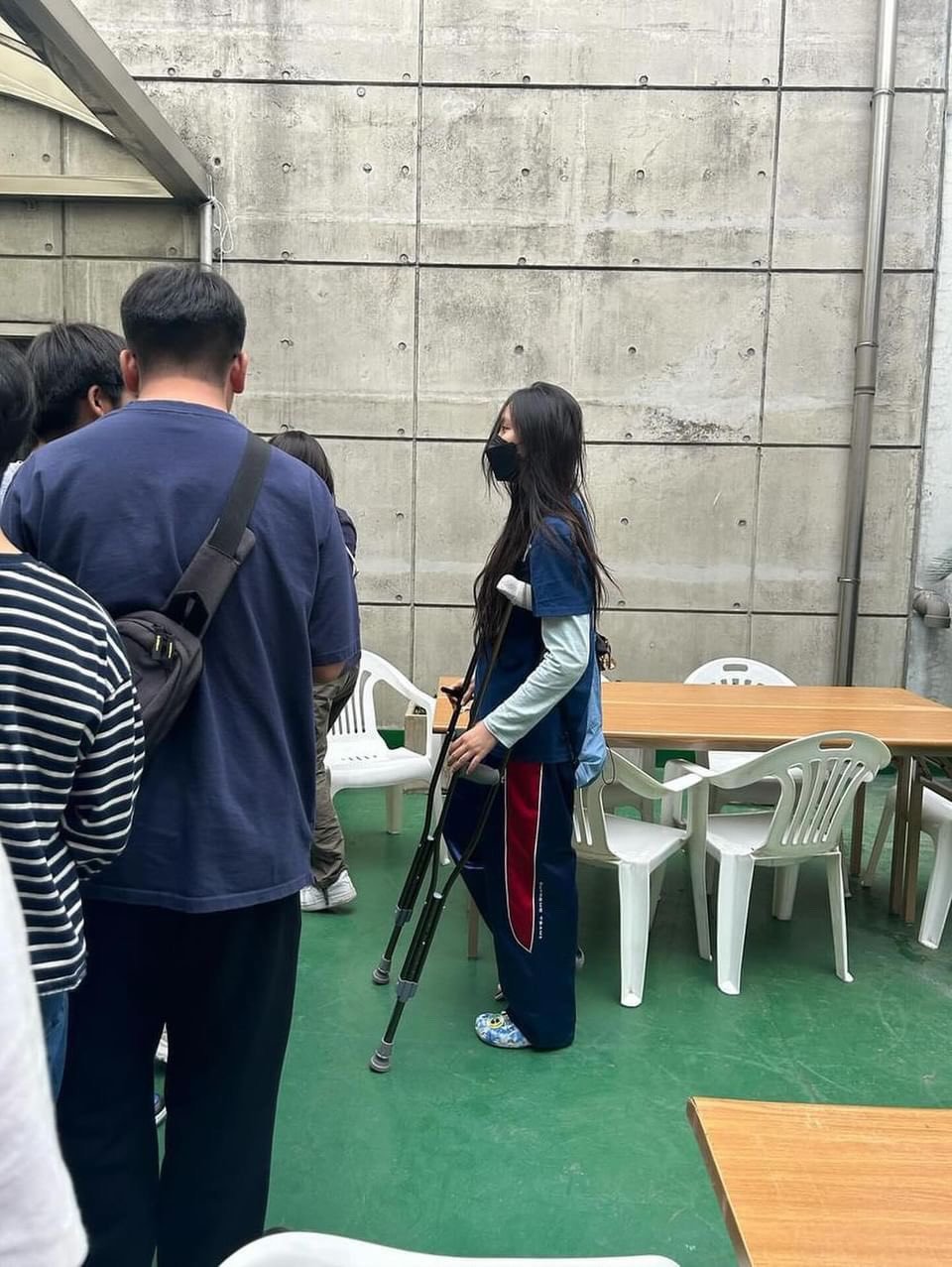 NewJeans成員Hyein最近拄著枴杖的模樣被粉絲捕捉到,網路上流傳著一張Hyein拄著枴杖的照片,據悉是她在教堂附近被拍到的。