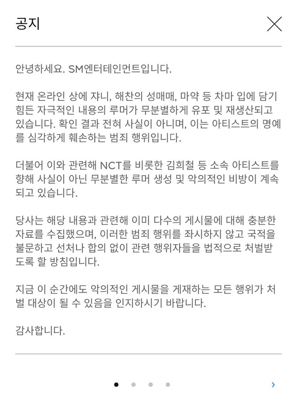 此外,針對NCT和包括希澈在內的其他旗下藝人,惡意謠言和誹謗行為仍在持續發生。