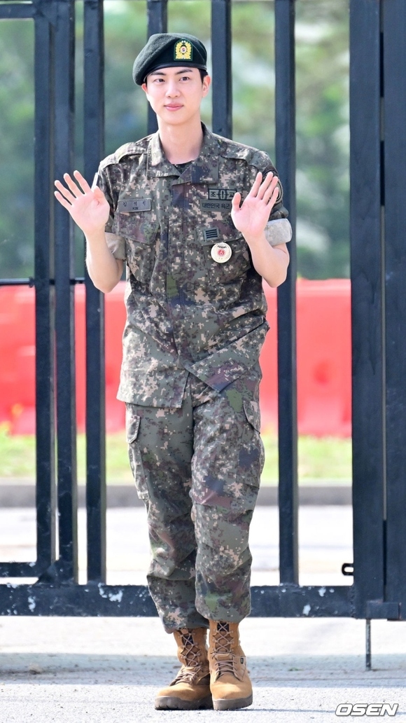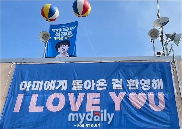 現場雖然沒有粉絲,但心卻與他同在。部隊前停放了一輛淡紫色的巴士,吸引了人們的目光。巴士上掛著祝賀他退伍的橫幅,上面寫著:「地球愛你,宇宙支持你,特級戰士金碩珍(真實姓名)」「與ARMY永遠在一起」「歡迎回到ARMY的懷抱 I LOVE YOU」「碩珍,你辛苦了548天」「以不變的愛守護在你身邊」等字句。空中還飄著慶祝他退伍的廣告氣球,場面溫馨感人。