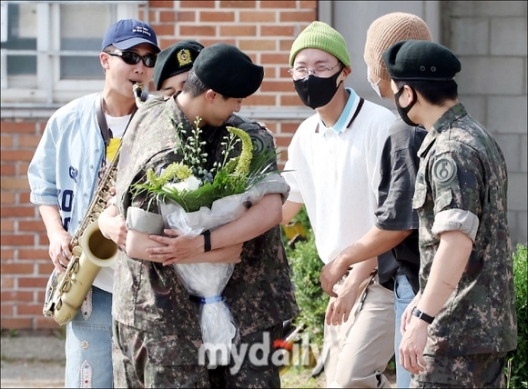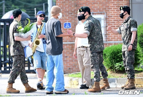 成員們也三五成群地聚集在一起,祝賀真的退伍。特別是RM,他親自演奏薩克斯風,以獨特的方式慶祝真的退伍,吸引了大家的目光。其餘成員們也送上了準備好的花束,並給予擁抱,熱烈祝賀他的退伍。