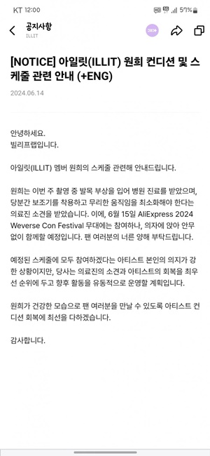 公司還表示:「她將參加6月15日的2024 Weverse Con Festival舞台演出,但會以坐在椅子上、不進行舞蹈的方式參與。我們將以醫療人員的意見和藝人的恢復為最優先,靈活安排今後的活動計劃。」