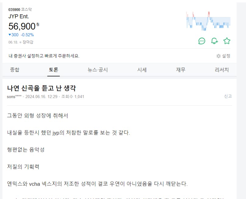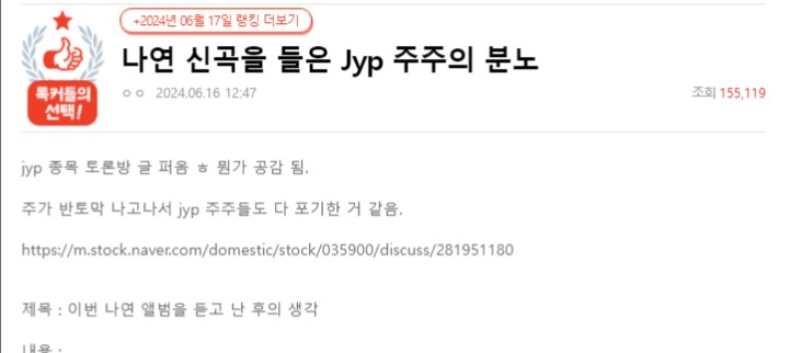 一位個人股東在「Naver股票論壇」上發文表示:「聽了娜璉的新歌後,我有了感悟」,並表達了對JYP現狀的嘆息。