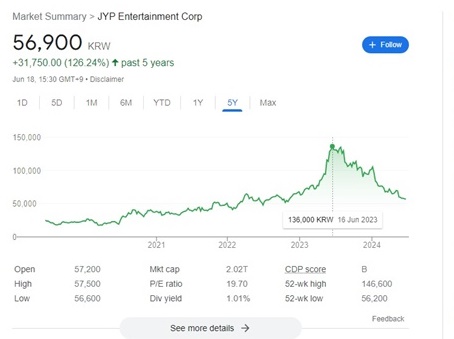 JYP在過去幾年中,在音源成績方面一直表現不佳。表現良好的僅有Day6。直到最近,由於音盤成績較好,所以音源成績不佳的情況被忽視。然而,自2023年秋季以來,K-POP音盤市場出現變動,無論是什麼經紀公司,人氣團體的專輯銷量都出現下滑。在依賴的音盤市場崩潰的同時,音源成績也無法挽回。缺乏利好消息導致股價下跌,股東的不滿情緒積壓。