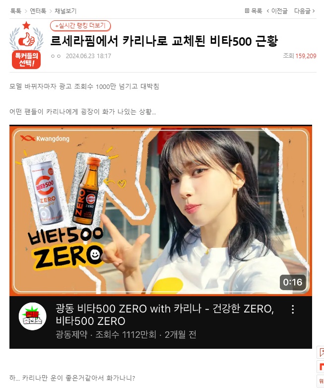 然而,品牌的新成功也引發了一些爭議。 在Karina被選為「Vita 500 ZERO」代言人之前,這個位置是由LE SSERAFIM這個團體擔任的。 她們的廣告獲得了大約300萬到500萬的觀看次數。