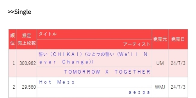 另一方面,TXT的新作《CHIKAI》首日銷量達到「300,982張」(根據Oricon),是aespa的十倍。